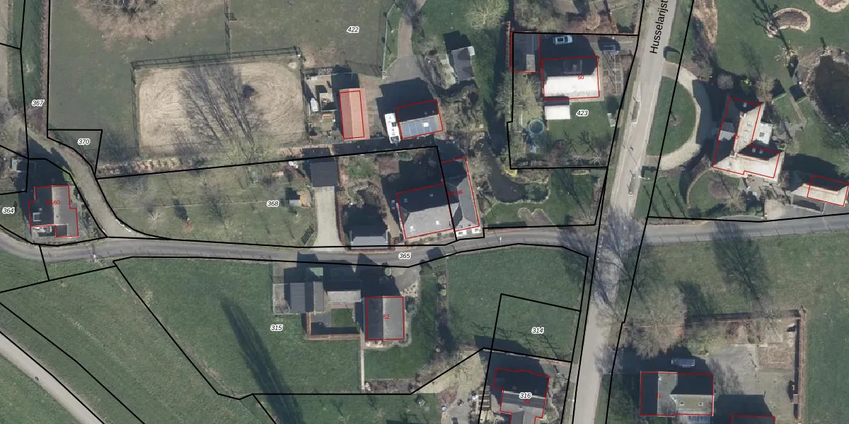 Het perceel waarop Husselarijstraat 54 staat heeft een oppervlakte van 1525 m². Dit is een zeer groot perceel. De perceeloppervlakte wordt geregistreerd door het Kadaster. Gedetailleerde informatie over de maten van dit perceel kunt u vinden in het rapport Kadastrale kaart met maatvoering van Husselarijstraat 54.