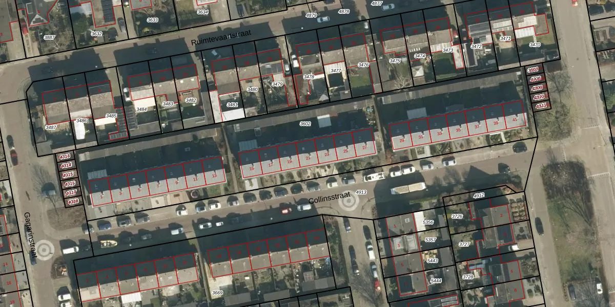 Het perceel waarop Collinsstraat 21 staat heeft een oppervlakte van 3561 m². Dit is een zeer groot perceel. De perceeloppervlakte wordt geregistreerd door het Kadaster. Gedetailleerde informatie over de maten van dit perceel kunt u vinden in het rapport Kadastrale kaart met maatvoering van Collinsstraat 21.