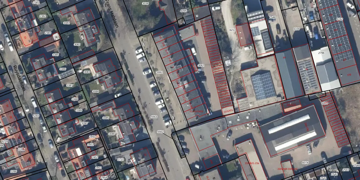 Het perceel waarop Frans Halslaan 15 staat heeft een oppervlakte van 1673 m². Dit is een zeer groot perceel. De perceeloppervlakte wordt geregistreerd door het Kadaster. Gedetailleerde informatie over de maten van dit perceel kunt u vinden in het rapport Kadastrale kaart met maatvoering van Frans Halslaan 15.