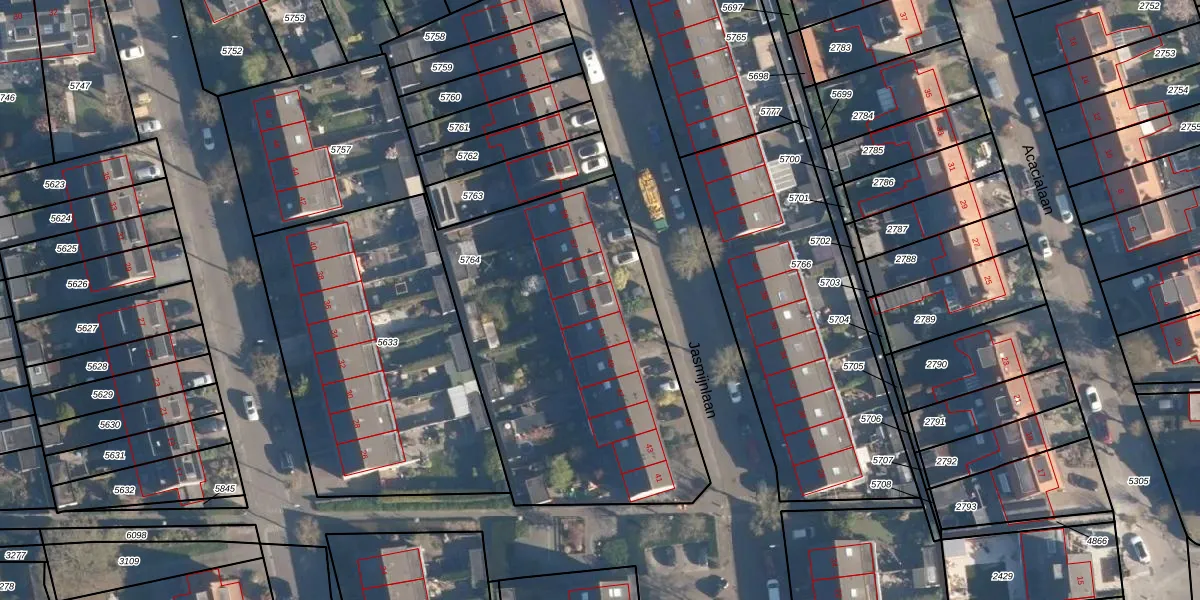 Jasmijnlaan 53 is gelegen op kadastraal perceel LDT00C5764. Deze kadastrale aanduiding is uniek en wordt gebruikt door het Kadaster om eigendomsrechten en andere zakelijke rechten vast te leggen. Het perceel maakt onderdeel uit van de kadastrale gemeente Loosdrecht.