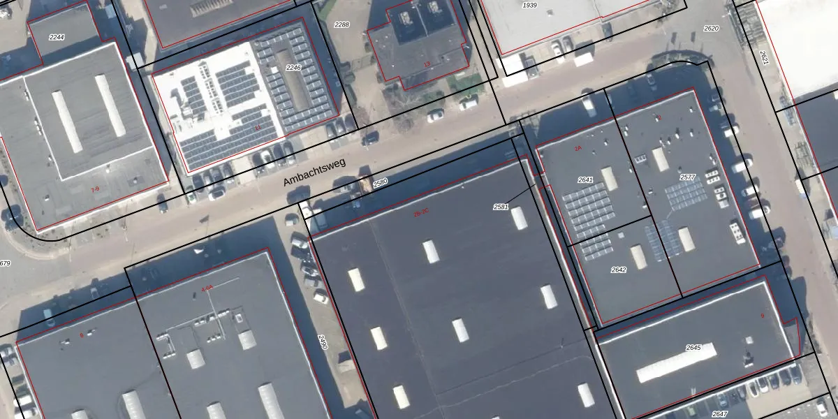 Het perceel waarop Ambachtsweg 2-B staat heeft een oppervlakte van 1,5 ha. Dit is een zeer groot perceel. De perceeloppervlakte wordt geregistreerd door het Kadaster. Gedetailleerde informatie over de maten van dit perceel kunt u vinden in het rapport Kadastrale kaart met maatvoering van Ambachtsweg 2-B.