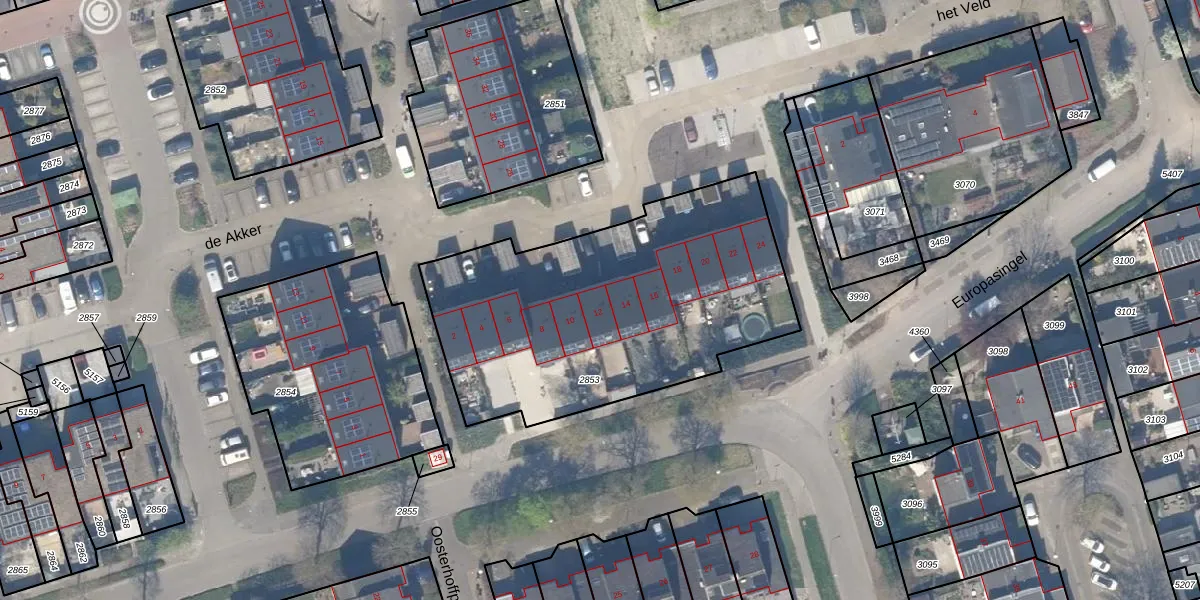 de Akker 12 is gelegen op kadastraal perceel JVD00B2853. Deze kadastrale aanduiding is uniek en wordt gebruikt door het Kadaster om eigendomsrechten en andere zakelijke rechten vast te leggen. Het perceel maakt onderdeel uit van de kadastrale gemeente Jaarsveld.