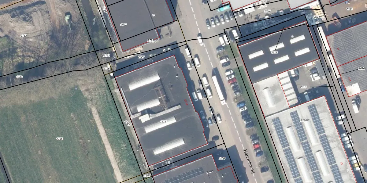 Het perceel waarop Handelsweg 12 staat heeft een oppervlakte van 2505 m². Dit is een zeer groot perceel. De perceeloppervlakte wordt geregistreerd door het Kadaster. Gedetailleerde informatie over de maten van dit perceel kunt u vinden in het rapport Kadastrale kaart met maatvoering van Handelsweg 12.