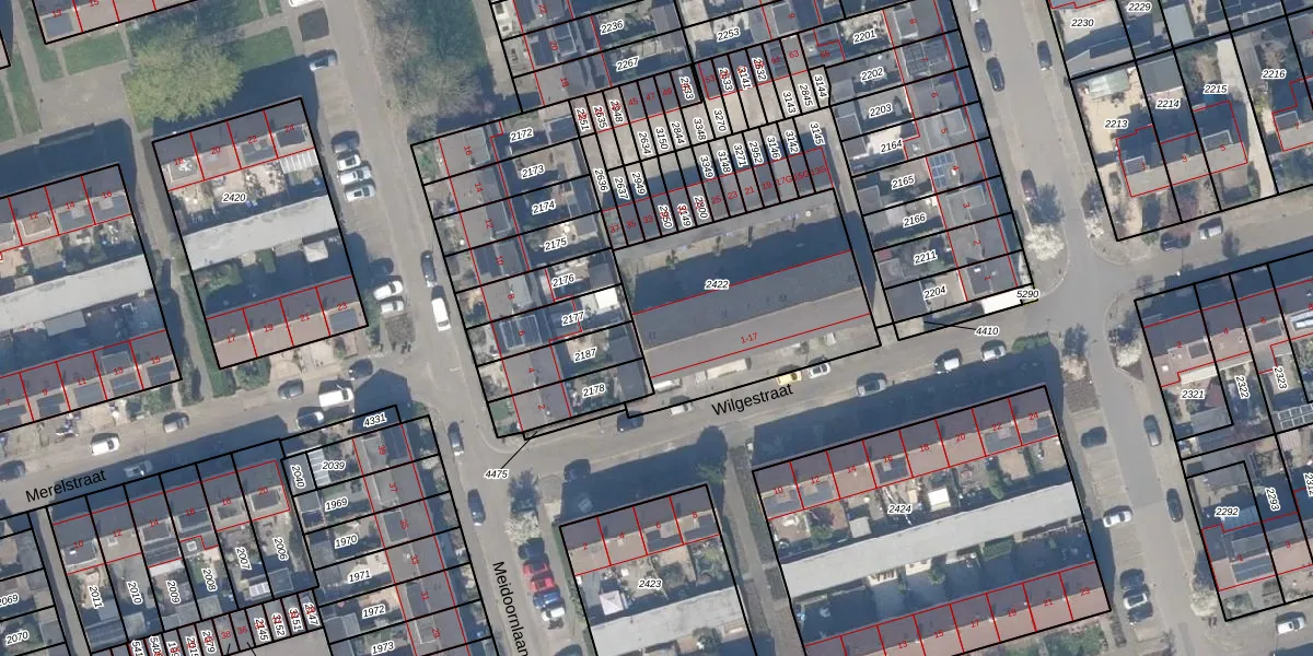 Wilgestraat 13 is gelegen op kadastraal perceel JVD00B2422. Deze kadastrale aanduiding is uniek en wordt gebruikt door het Kadaster om eigendomsrechten en andere zakelijke rechten vast te leggen. Het perceel maakt onderdeel uit van de kadastrale gemeente Jaarsveld.