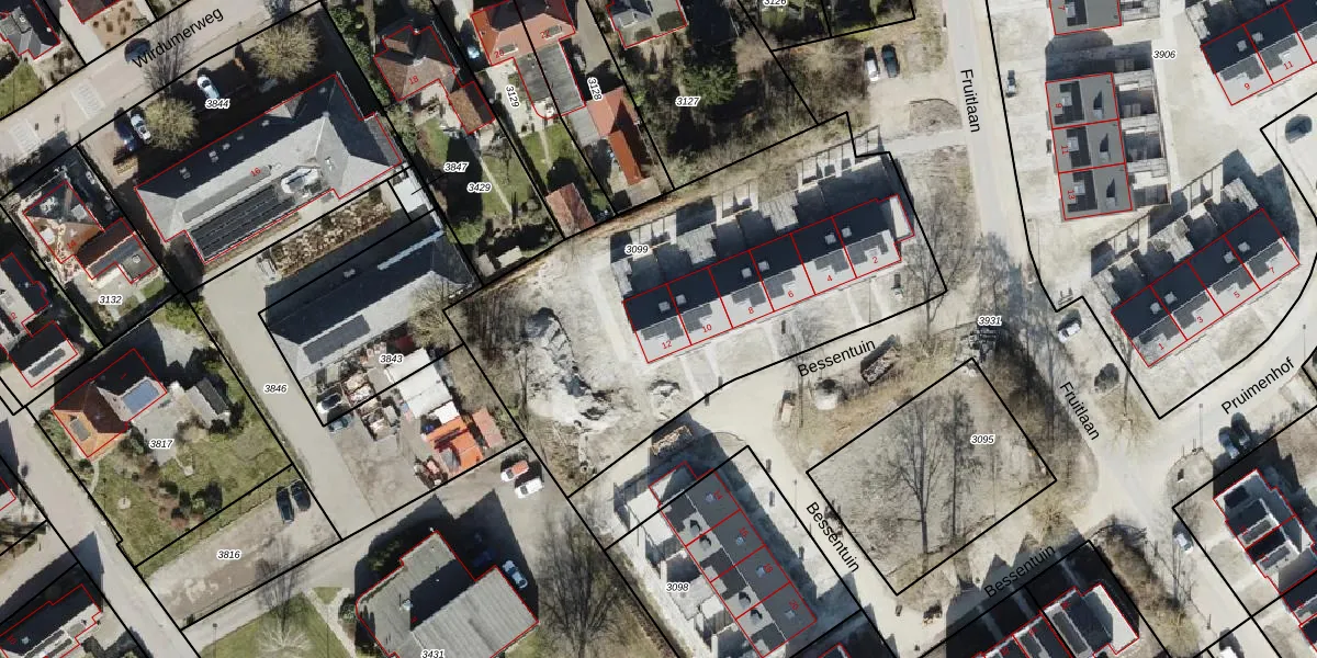 Het perceel waarop Bessentuin 12 staat heeft een oppervlakte van 2136 m². Dit is een zeer groot perceel. De perceeloppervlakte wordt geregistreerd door het Kadaster. Gedetailleerde informatie over de maten van dit perceel kunt u vinden in het rapport Kadastrale kaart met maatvoering van Bessentuin 12.