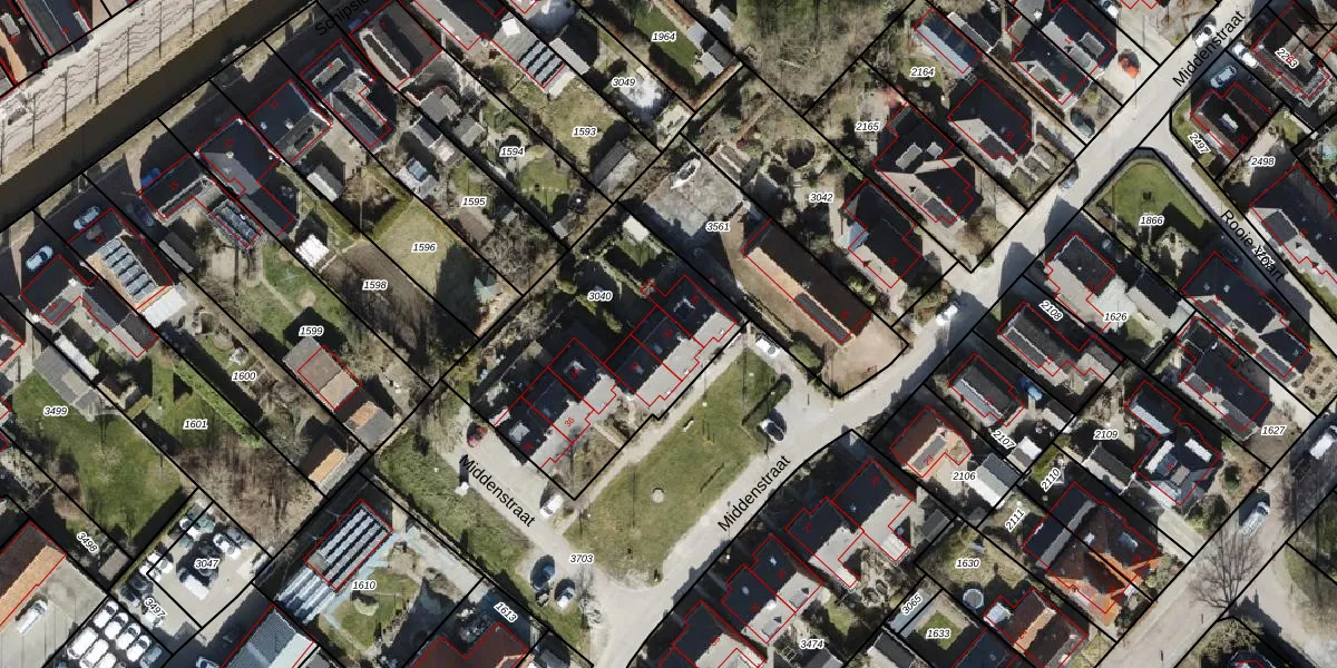 Het perceel waarop Middenstraat 30 staat heeft een oppervlakte van 1015 m². Dit is een zeer groot perceel. De perceeloppervlakte wordt geregistreerd door het Kadaster. Gedetailleerde informatie over de maten van dit perceel kunt u vinden in het rapport Kadastrale kaart met maatvoering van Middenstraat 30.