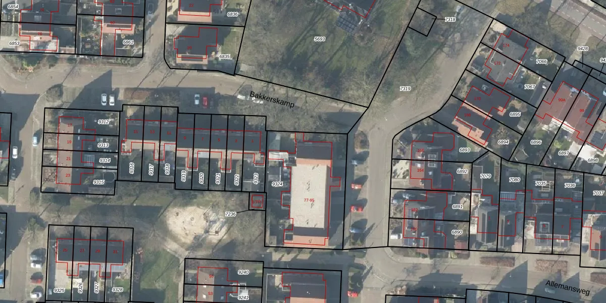Het perceel waarop Bakkerskamp 95 staat heeft een oppervlakte van 1006 m². Dit is een zeer groot perceel. De perceeloppervlakte wordt geregistreerd door het Kadaster. Gedetailleerde informatie over de maten van dit perceel kunt u vinden in het rapport Kadastrale kaart met maatvoering van Bakkerskamp 95.