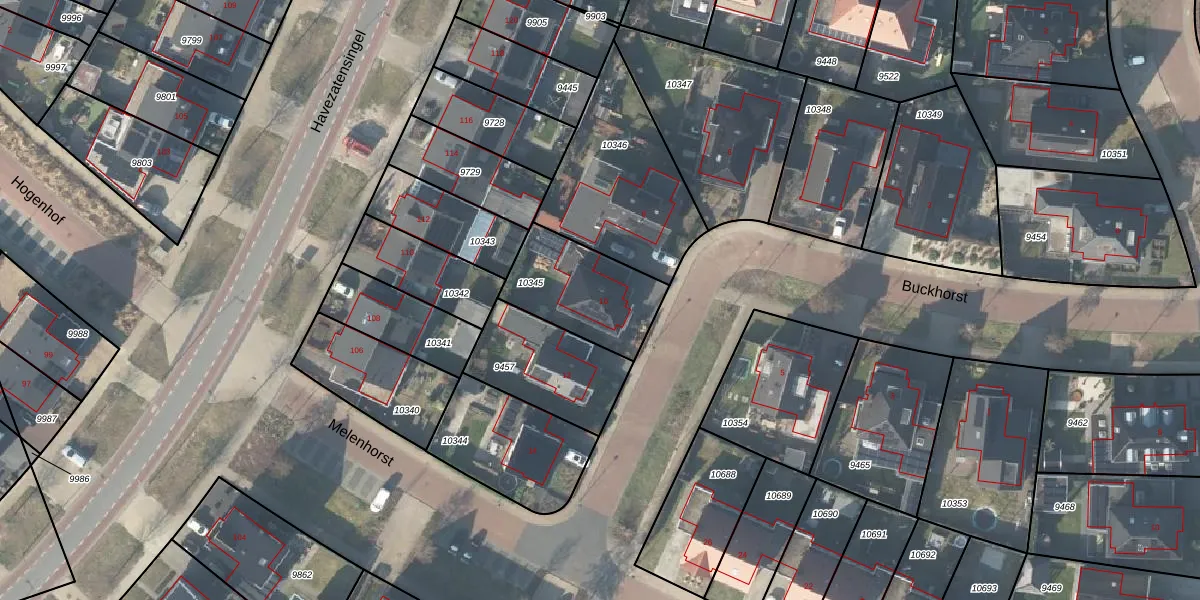Het perceel waarop Buckhorst 10 staat heeft een oppervlakte van 352 m². Dit is een groot perceel. De perceeloppervlakte wordt geregistreerd door het Kadaster. Gedetailleerde informatie over de maten van dit perceel kunt u vinden in het rapport Kadastrale kaart met maatvoering van Buckhorst 10.