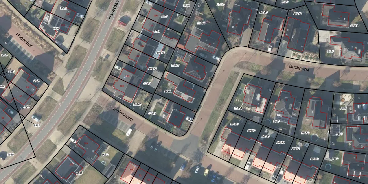 Het perceel waarop Buckhorst 12 staat heeft een oppervlakte van 344 m². Dit is een groot perceel. De perceeloppervlakte wordt geregistreerd door het Kadaster. Gedetailleerde informatie over de maten van dit perceel kunt u vinden in het rapport Kadastrale kaart met maatvoering van Buckhorst 12.