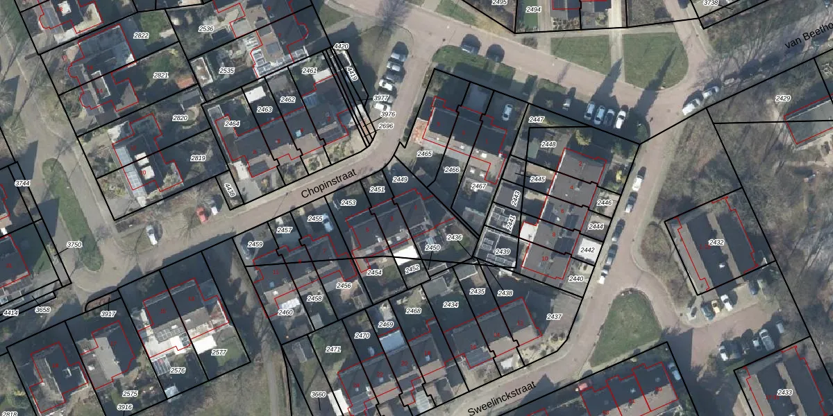 Het perceel waarop Chopinstraat 1 staat heeft een oppervlakte van 266 m². Dit is een middelgroot perceel. De perceeloppervlakte wordt geregistreerd door het Kadaster. Gedetailleerde informatie over de maten van dit perceel kunt u vinden in het rapport Kadastrale kaart met maatvoering van Chopinstraat 1.