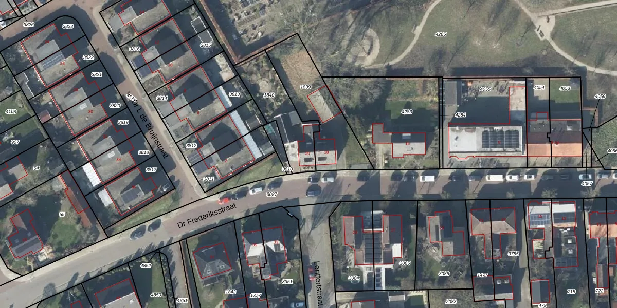 Het perceel waarop Dr Frederiksstraat 20 staat heeft een oppervlakte van 432 m². Dit is een groot perceel. De perceeloppervlakte wordt geregistreerd door het Kadaster. Gedetailleerde informatie over de maten van dit perceel kunt u vinden in het rapport Kadastrale kaart met maatvoering van Dr Frederiksstraat 20.