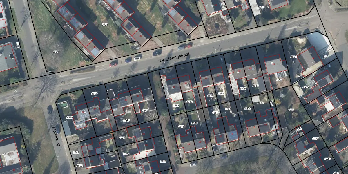 Het perceel waarop Dr Staringstraat 31 staat heeft een oppervlakte van 260 m². Dit is een middelgroot perceel. De perceeloppervlakte wordt geregistreerd door het Kadaster. Gedetailleerde informatie over de maten van dit perceel kunt u vinden in het rapport Kadastrale kaart met maatvoering van Dr Staringstraat 31.