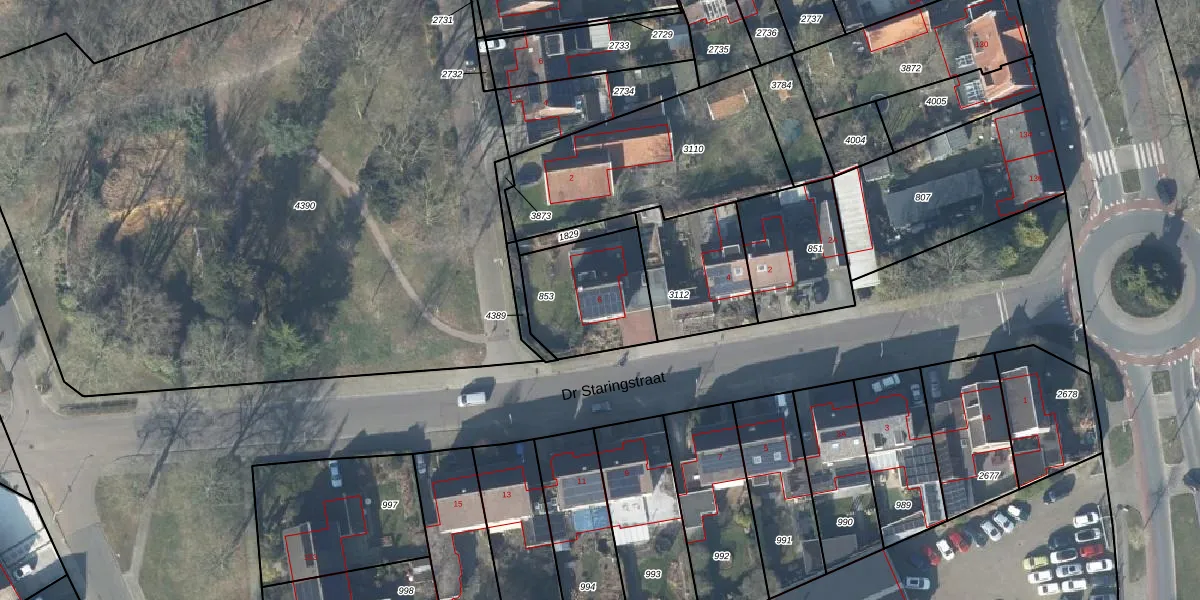 Het perceel waarop Dr Staringstraat 6 staat heeft een oppervlakte van 378 m². Dit is een groot perceel. De perceeloppervlakte wordt geregistreerd door het Kadaster. Gedetailleerde informatie over de maten van dit perceel kunt u vinden in het rapport Kadastrale kaart met maatvoering van Dr Staringstraat 6.