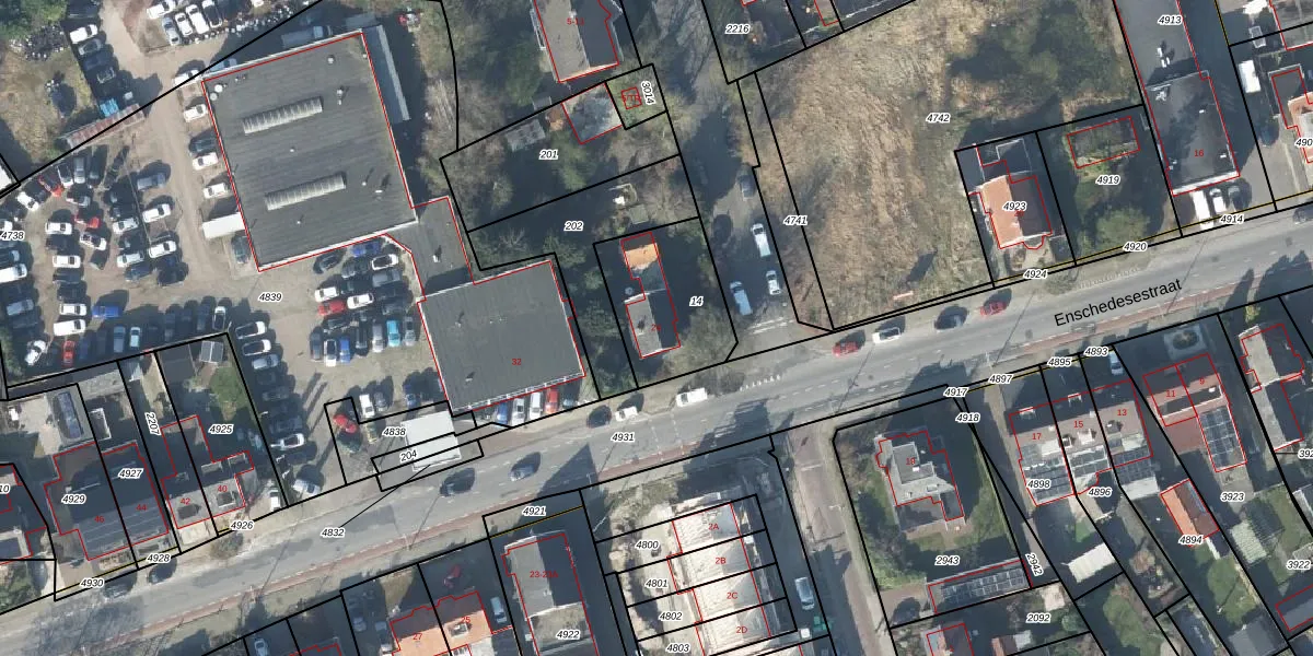 Het perceel waarop Enschedesestraat 24 staat heeft een oppervlakte van 379 m². Dit is een groot perceel. De perceeloppervlakte wordt geregistreerd door het Kadaster. Gedetailleerde informatie over de maten van dit perceel kunt u vinden in het rapport Kadastrale kaart met maatvoering van Enschedesestraat 24.