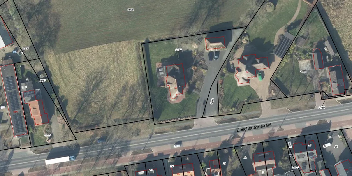 Enschedesestraat 56 is gelegen op kadastraal perceel LSR00H6417. Deze kadastrale aanduiding is uniek en wordt gebruikt door het Kadaster om eigendomsrechten en andere zakelijke rechten vast te leggen. Het perceel maakt onderdeel uit van de kadastrale gemeente Losser.
