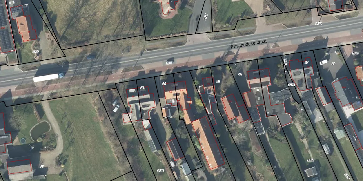 Het perceel waarop Enschedesestraat 63 staat heeft een oppervlakte van 1865 m². Dit is een zeer groot perceel. De perceeloppervlakte wordt geregistreerd door het Kadaster. Gedetailleerde informatie over de maten van dit perceel kunt u vinden in het rapport Kadastrale kaart met maatvoering van Enschedesestraat 63.