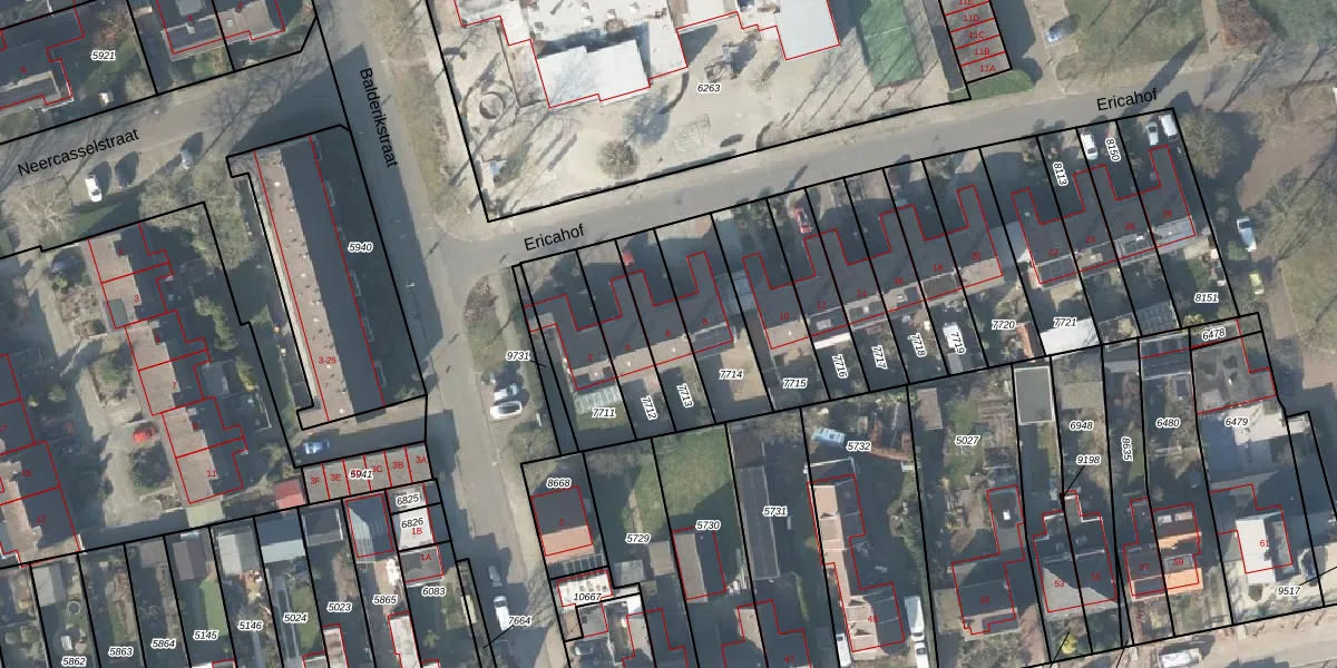 Het perceel waarop Ericahof 6 staat heeft een oppervlakte van 185 m². Dit is een middelgroot perceel. De perceeloppervlakte wordt geregistreerd door het Kadaster. Gedetailleerde informatie over de maten van dit perceel kunt u vinden in het rapport Kadastrale kaart met maatvoering van Ericahof 6.