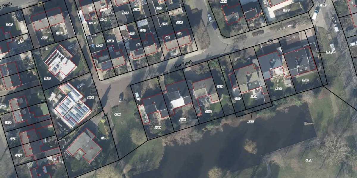 Het perceel waarop Hooibeek 9 staat heeft een oppervlakte van 474 m². Dit is een groot perceel. De perceeloppervlakte wordt geregistreerd door het Kadaster. Gedetailleerde informatie over de maten van dit perceel kunt u vinden in het rapport Kadastrale kaart met maatvoering van Hooibeek 9.