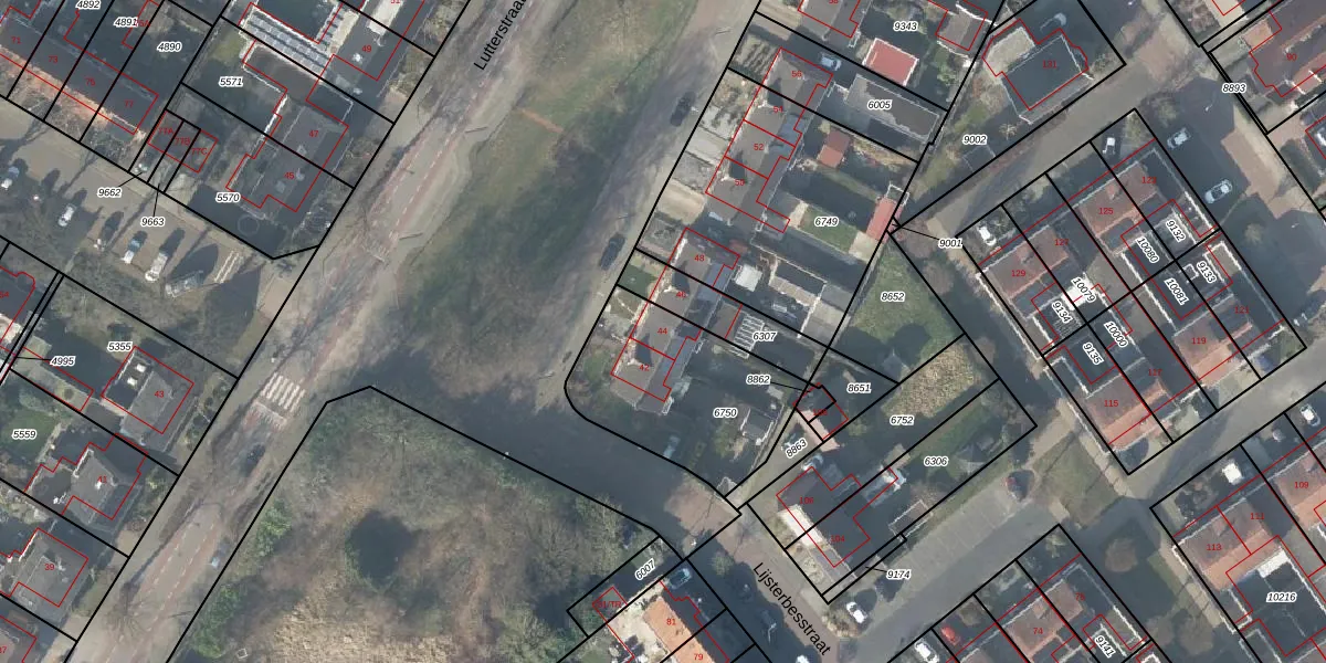 Het perceel waarop Lutterstraat 44 staat heeft een oppervlakte van 630 m². Dit is een groot perceel. De perceeloppervlakte wordt geregistreerd door het Kadaster. Gedetailleerde informatie over de maten van dit perceel kunt u vinden in het rapport Kadastrale kaart met maatvoering van Lutterstraat 44.
