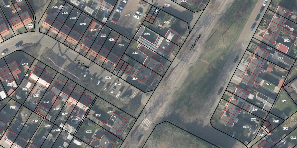 Lutterstraat 45 is gelegen op kadastraal perceel LSR00H5570. Deze kadastrale aanduiding is uniek en wordt gebruikt door het Kadaster om eigendomsrechten en andere zakelijke rechten vast te leggen. Het perceel maakt onderdeel uit van de kadastrale gemeente Losser.