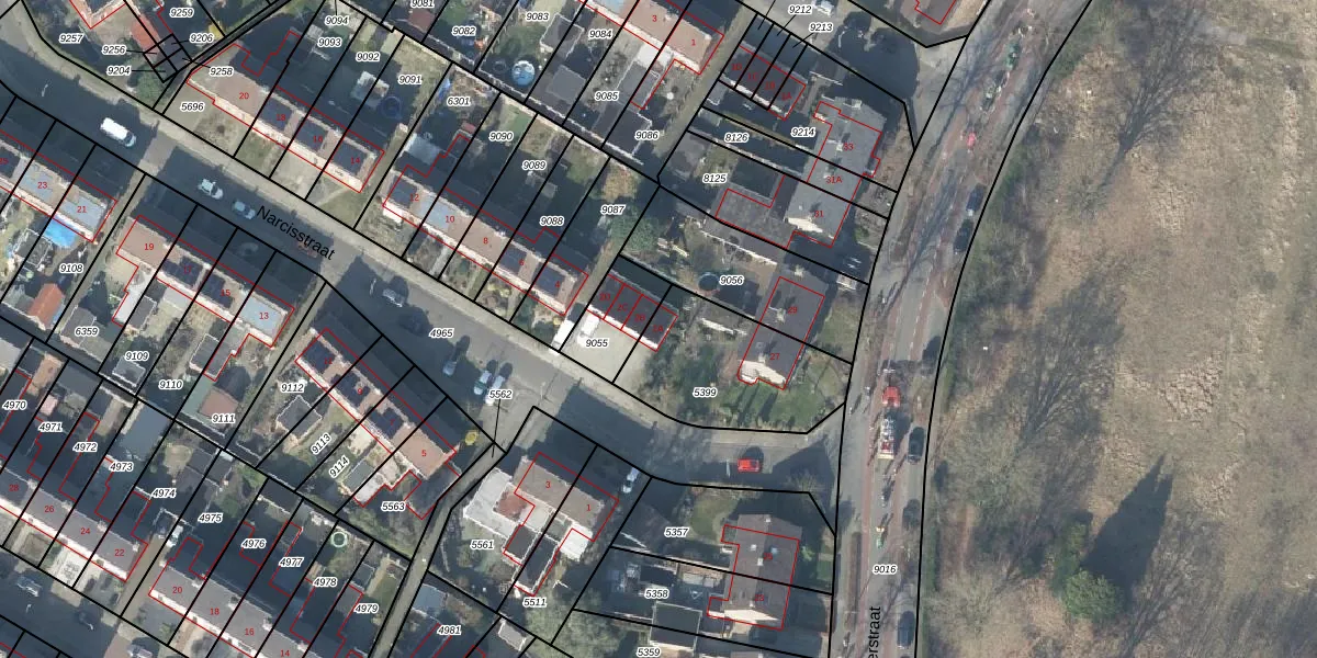 Het perceel waarop Narcisstraat 2-A staat heeft een oppervlakte van 513 m². Dit is een groot perceel. De perceeloppervlakte wordt geregistreerd door het Kadaster. Gedetailleerde informatie over de maten van dit perceel kunt u vinden in het rapport Kadastrale kaart met maatvoering van Narcisstraat 2-A.
