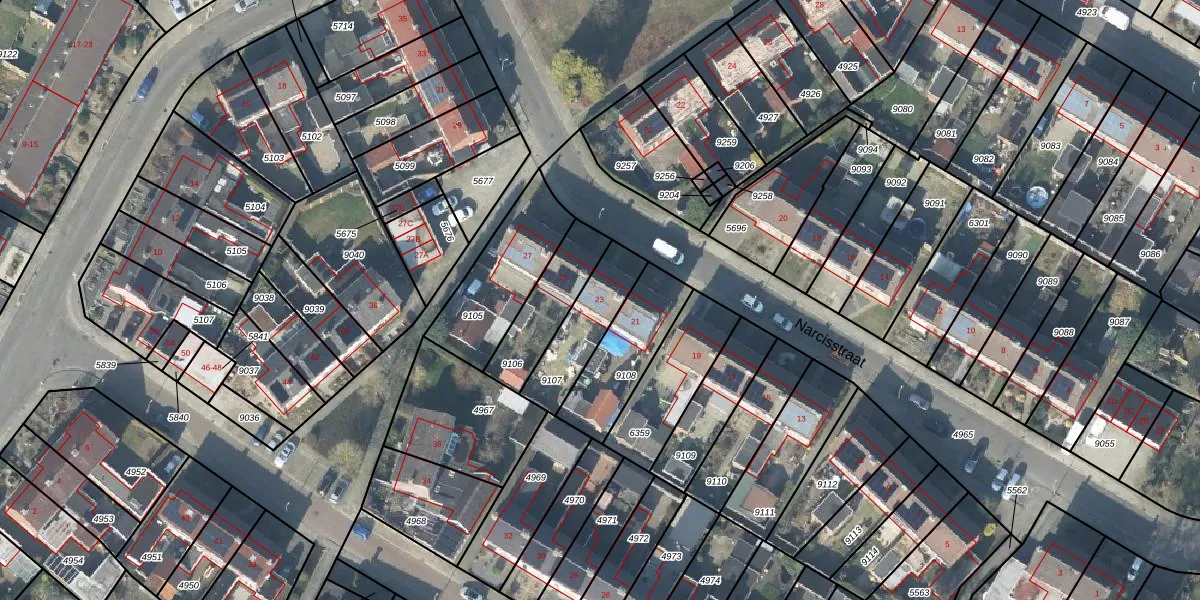 Het perceel waarop Narcisstraat 23 staat heeft een oppervlakte van 213 m². Dit is een middelgroot perceel. De perceeloppervlakte wordt geregistreerd door het Kadaster. Gedetailleerde informatie over de maten van dit perceel kunt u vinden in het rapport Kadastrale kaart met maatvoering van Narcisstraat 23.