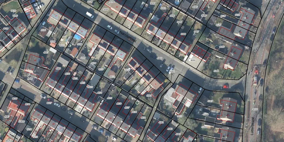 Het perceel waarop Narcisstraat 9 staat heeft een oppervlakte van 182 m². Dit is een middelgroot perceel. De perceeloppervlakte wordt geregistreerd door het Kadaster. Gedetailleerde informatie over de maten van dit perceel kunt u vinden in het rapport Kadastrale kaart met maatvoering van Narcisstraat 9.