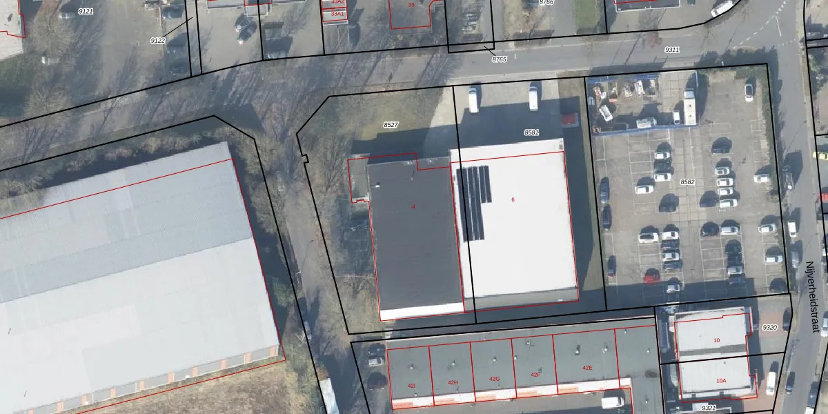 Het perceel waarop Nijverheidstraat 4 staat heeft een oppervlakte van 2003 m². Dit is een zeer groot perceel. De perceeloppervlakte wordt geregistreerd door het Kadaster. Gedetailleerde informatie over de maten van dit perceel kunt u vinden in het rapport Kadastrale kaart met maatvoering van Nijverheidstraat 4.