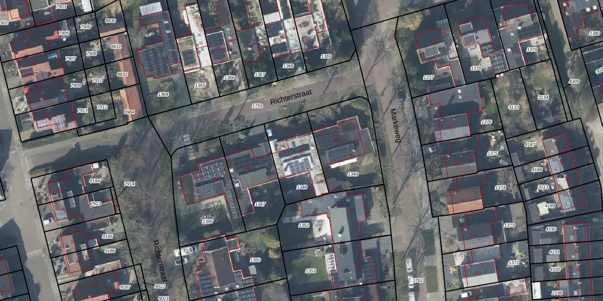 Het perceel waarop Richterstraat 46 staat heeft een oppervlakte van 415 m². Dit is een groot perceel. De perceeloppervlakte wordt geregistreerd door het Kadaster. Gedetailleerde informatie over de maten van dit perceel kunt u vinden in het rapport Kadastrale kaart met maatvoering van Richterstraat 46.