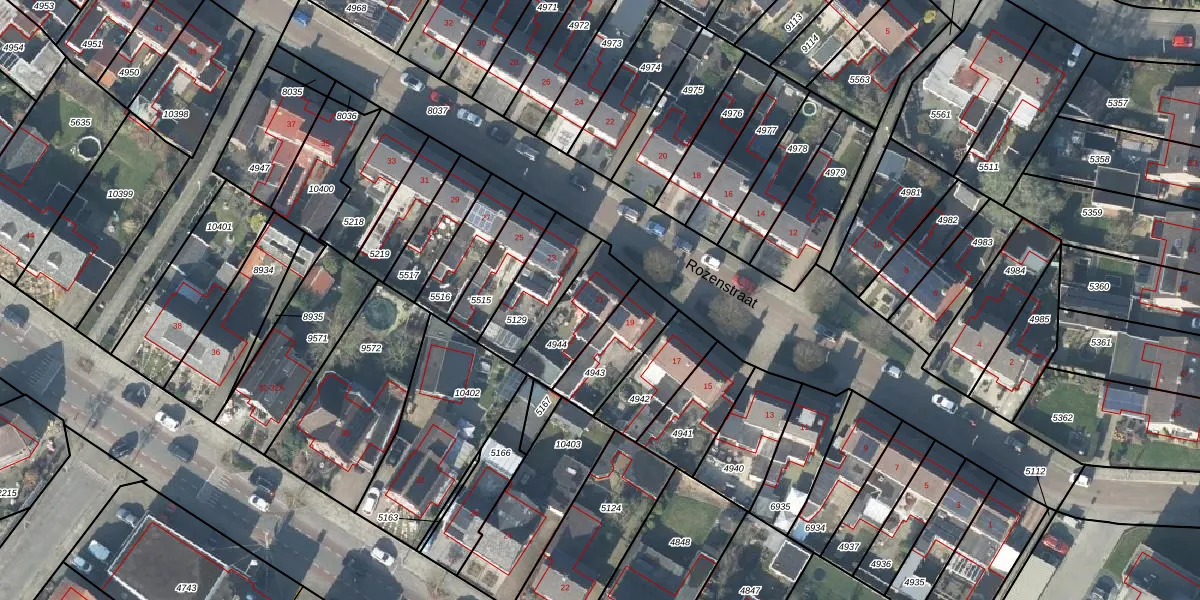 Rozenstraat 21 is gelegen op kadastraal perceel LSR00H4944. Deze kadastrale aanduiding is uniek en wordt gebruikt door het Kadaster om eigendomsrechten en andere zakelijke rechten vast te leggen. Het perceel maakt onderdeel uit van de kadastrale gemeente Losser.