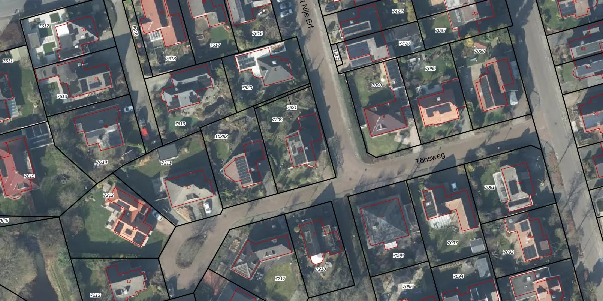 Het perceel waarop Tönsweg 21 staat heeft een oppervlakte van 605 m². Dit is een groot perceel. De perceeloppervlakte wordt geregistreerd door het Kadaster. Gedetailleerde informatie over de maten van dit perceel kunt u vinden in het rapport Kadastrale kaart met maatvoering van Tönsweg 21.