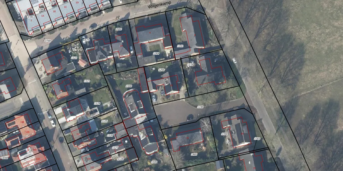 Het perceel waarop Wilgenkamp 10 staat heeft een oppervlakte van 506 m². Dit is een groot perceel. De perceeloppervlakte wordt geregistreerd door het Kadaster. Gedetailleerde informatie over de maten van dit perceel kunt u vinden in het rapport Kadastrale kaart met maatvoering van Wilgenkamp 10.