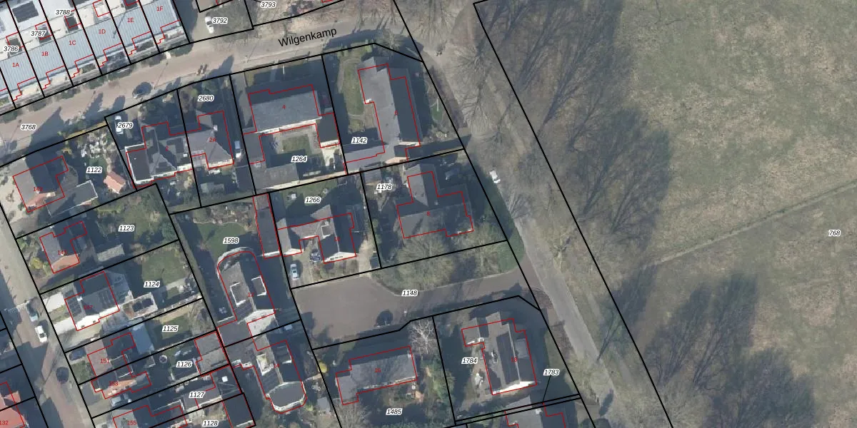 Het perceel waarop Wilgenkamp 8 staat heeft een oppervlakte van 635 m². Dit is een groot perceel. De perceeloppervlakte wordt geregistreerd door het Kadaster. Gedetailleerde informatie over de maten van dit perceel kunt u vinden in het rapport Kadastrale kaart met maatvoering van Wilgenkamp 8.