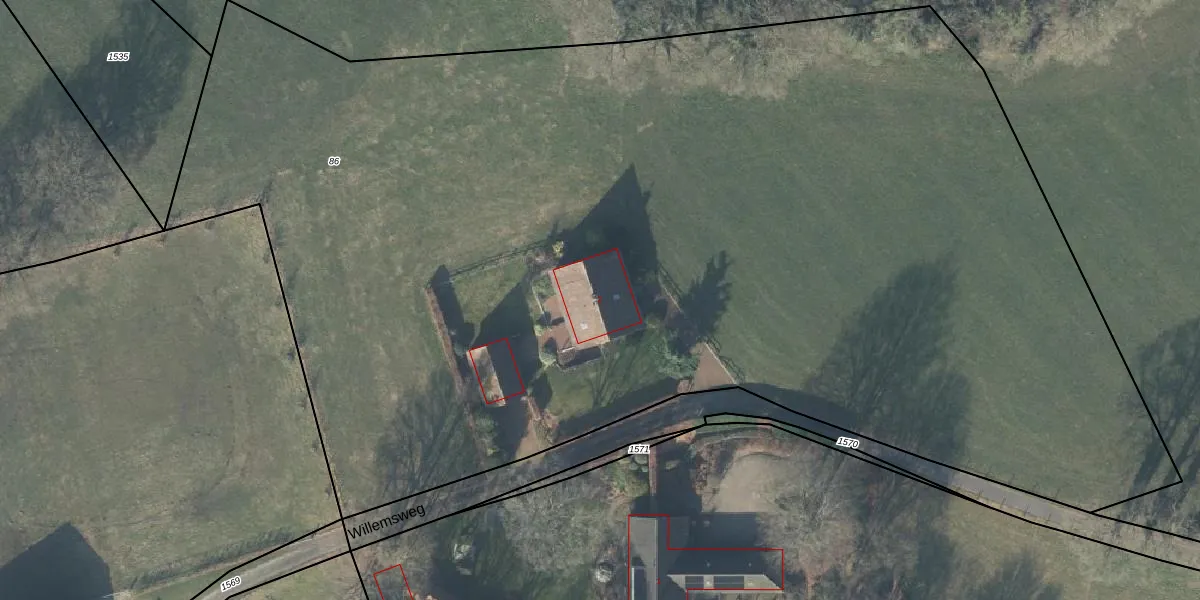 Het perceel waarop Willemsweg 2 staat heeft een oppervlakte van 9575 m². Dit is een zeer groot perceel. De perceeloppervlakte wordt geregistreerd door het Kadaster. Gedetailleerde informatie over de maten van dit perceel kunt u vinden in het rapport Kadastrale kaart met maatvoering van Willemsweg 2.