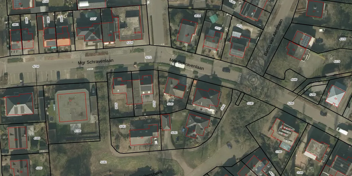 Mgr Schravenlaan 13-b is gelegen op kadastraal perceel GBV00A5040. Deze kadastrale aanduiding is uniek en wordt gebruikt door het Kadaster om eigendomsrechten en andere zakelijke rechten vast te leggen. Het perceel maakt onderdeel uit van de kadastrale gemeente Grubbenvorst.