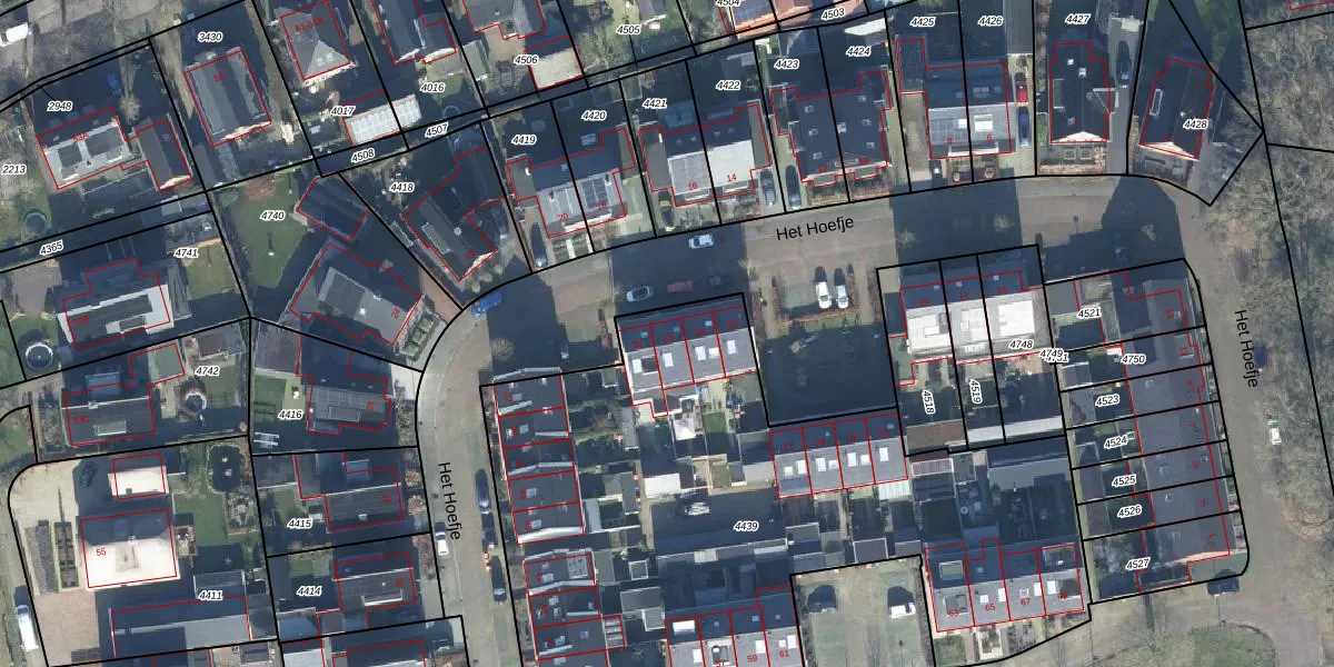 Het perceel waarop Het Hoefje 33 staat heeft een oppervlakte van 3475 m². Dit is een zeer groot perceel. De perceeloppervlakte wordt geregistreerd door het Kadaster. Gedetailleerde informatie over de maten van dit perceel kunt u vinden in het rapport Kadastrale kaart met maatvoering van Het Hoefje 33.