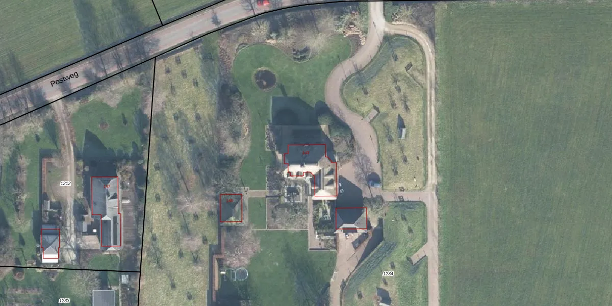 Het perceel waarop Postweg 143 staat heeft een oppervlakte van 3,3 ha. Dit is een zeer groot perceel. De perceeloppervlakte wordt geregistreerd door het Kadaster. Gedetailleerde informatie over de maten van dit perceel kunt u vinden in het rapport Kadastrale kaart met maatvoering van Postweg 143.