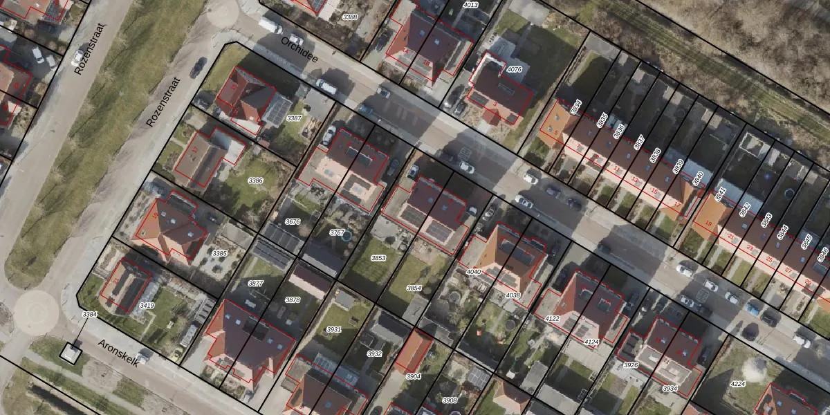 Het perceel waarop Orchidee 6 staat heeft een oppervlakte van 408 m². Dit is een groot perceel. De perceeloppervlakte wordt geregistreerd door het Kadaster. Gedetailleerde informatie over de maten van dit perceel kunt u vinden in het rapport Kadastrale kaart met maatvoering van Orchidee 6.