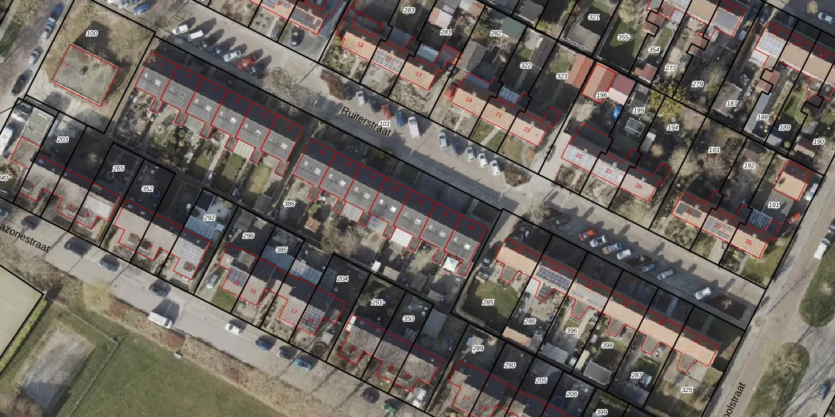 Het perceel waarop Ruiterstraat 22 staat heeft een oppervlakte van 3315 m². Dit is een zeer groot perceel. De perceeloppervlakte wordt geregistreerd door het Kadaster. Gedetailleerde informatie over de maten van dit perceel kunt u vinden in het rapport Kadastrale kaart met maatvoering van Ruiterstraat 22.