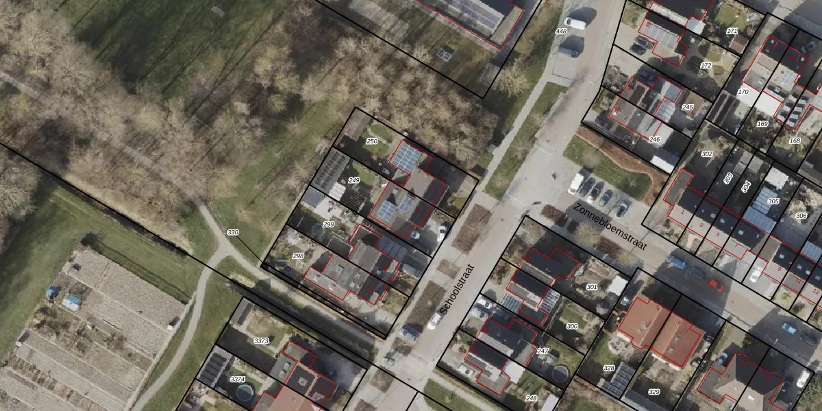 Het perceel waarop Schoolstraat 8 staat heeft een oppervlakte van 385 m². Dit is een groot perceel. De perceeloppervlakte wordt geregistreerd door het Kadaster. Gedetailleerde informatie over de maten van dit perceel kunt u vinden in het rapport Kadastrale kaart met maatvoering van Schoolstraat 8.