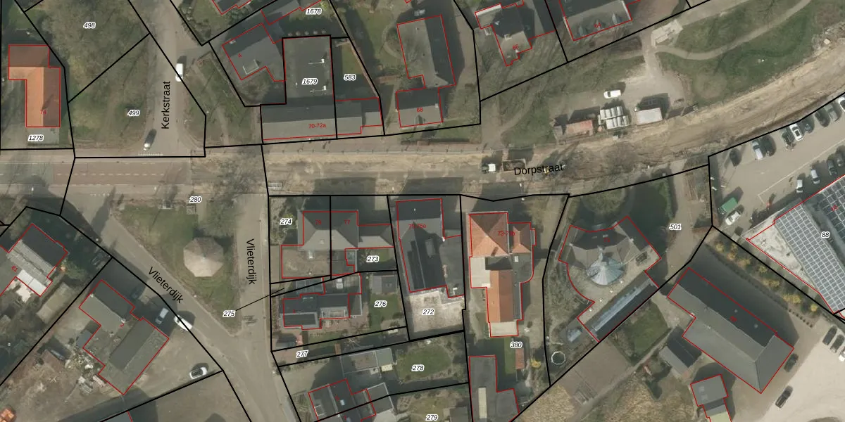 Het perceel waarop Dorpstraat 75 staat heeft een oppervlakte van 518 m². Dit is een groot perceel. De perceeloppervlakte wordt geregistreerd door het Kadaster. Gedetailleerde informatie over de maten van dit perceel kunt u vinden in het rapport Kadastrale kaart met maatvoering van Dorpstraat 75.