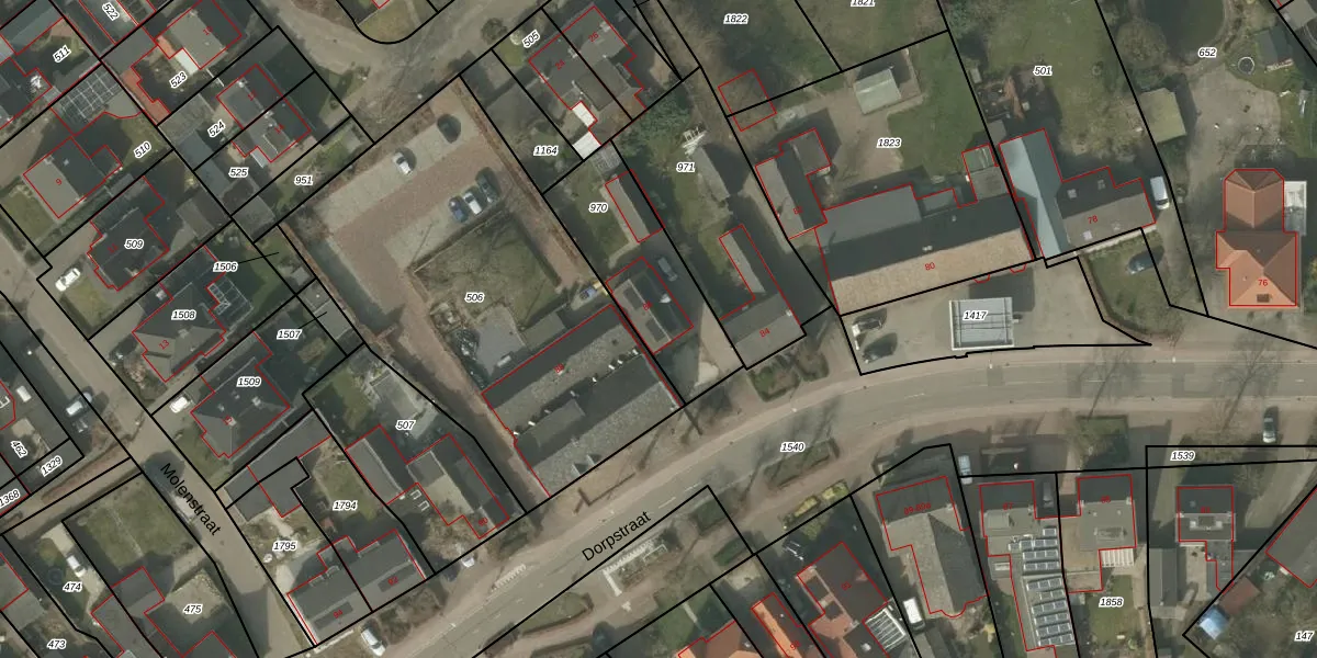 Het perceel waarop Dorpstraat 86 staat heeft een oppervlakte van 470 m². Dit is een groot perceel. De perceeloppervlakte wordt geregistreerd door het Kadaster. Gedetailleerde informatie over de maten van dit perceel kunt u vinden in het rapport Kadastrale kaart met maatvoering van Dorpstraat 86.