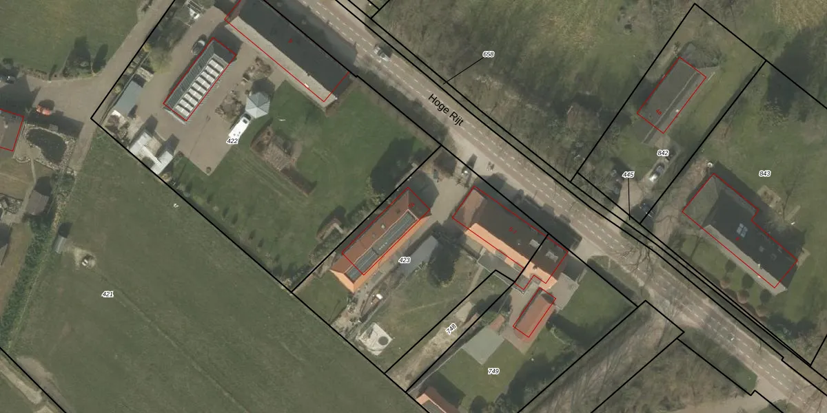Het perceel waarop Hoge Rijt 7-a staat heeft een oppervlakte van 1650 m². Dit is een zeer groot perceel. De perceeloppervlakte wordt geregistreerd door het Kadaster. Gedetailleerde informatie over de maten van dit perceel kunt u vinden in het rapport Kadastrale kaart met maatvoering van Hoge Rijt 7-a.