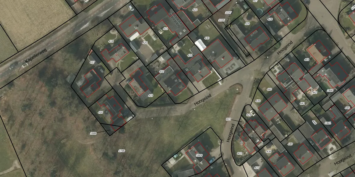 Het perceel waarop Hoogeind 7 staat heeft een oppervlakte van 421 m². Dit is een groot perceel. De perceeloppervlakte wordt geregistreerd door het Kadaster. Gedetailleerde informatie over de maten van dit perceel kunt u vinden in het rapport Kadastrale kaart met maatvoering van Hoogeind 7.