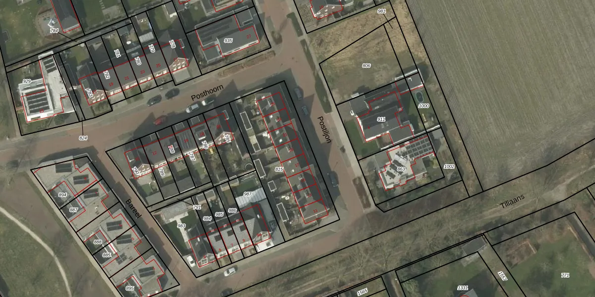 Het perceel waarop Postiljon 19 staat heeft een oppervlakte van 1005 m². Dit is een zeer groot perceel. De perceeloppervlakte wordt geregistreerd door het Kadaster. Gedetailleerde informatie over de maten van dit perceel kunt u vinden in het rapport Kadastrale kaart met maatvoering van Postiljon 19.