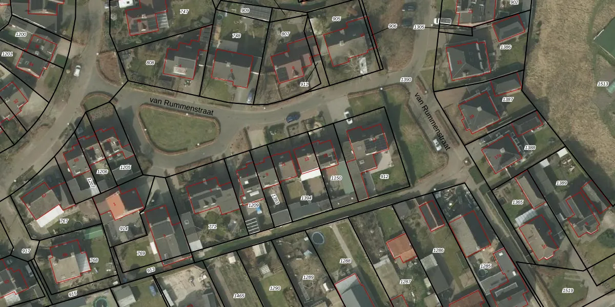 van Rummenstraat 13 is gelegen op kadastraal perceel LGT00F1394. Deze kadastrale aanduiding is uniek en wordt gebruikt door het Kadaster om eigendomsrechten en andere zakelijke rechten vast te leggen. Het perceel maakt onderdeel uit van de kadastrale gemeente Luyksgestel.