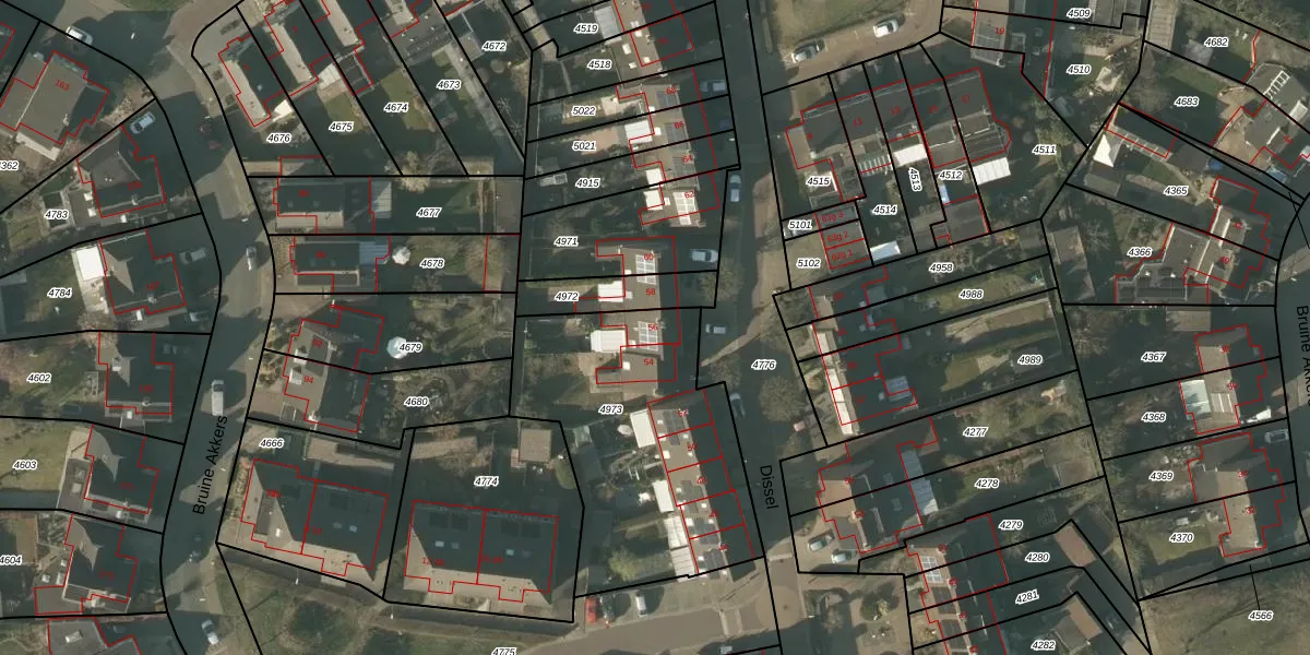 Het perceel waarop Dissel 56 staat heeft een oppervlakte van 1147 m². Dit is een zeer groot perceel. De perceeloppervlakte wordt geregistreerd door het Kadaster. Gedetailleerde informatie over de maten van dit perceel kunt u vinden in het rapport Kadastrale kaart met maatvoering van Dissel 56.