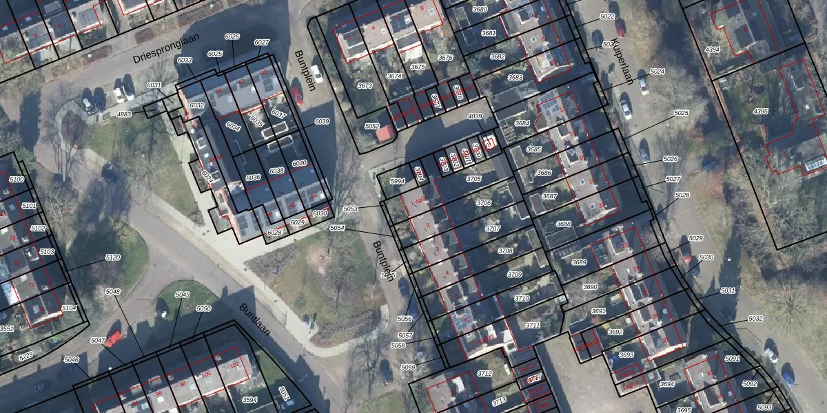 Buntplein 1 is gelegen op kadastraal perceel MAA00A3705. Deze kadastrale aanduiding is uniek en wordt gebruikt door het Kadaster om eigendomsrechten en andere zakelijke rechten vast te leggen. Het perceel maakt onderdeel uit van de kadastrale gemeente Maarn.