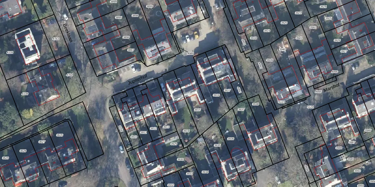 Het perceel waarop Jupiterhof 12 staat heeft een oppervlakte van 350 m². Dit is een groot perceel. De perceeloppervlakte wordt geregistreerd door het Kadaster. Gedetailleerde informatie over de maten van dit perceel kunt u vinden in het rapport Kadastrale kaart met maatvoering van Jupiterhof 12.