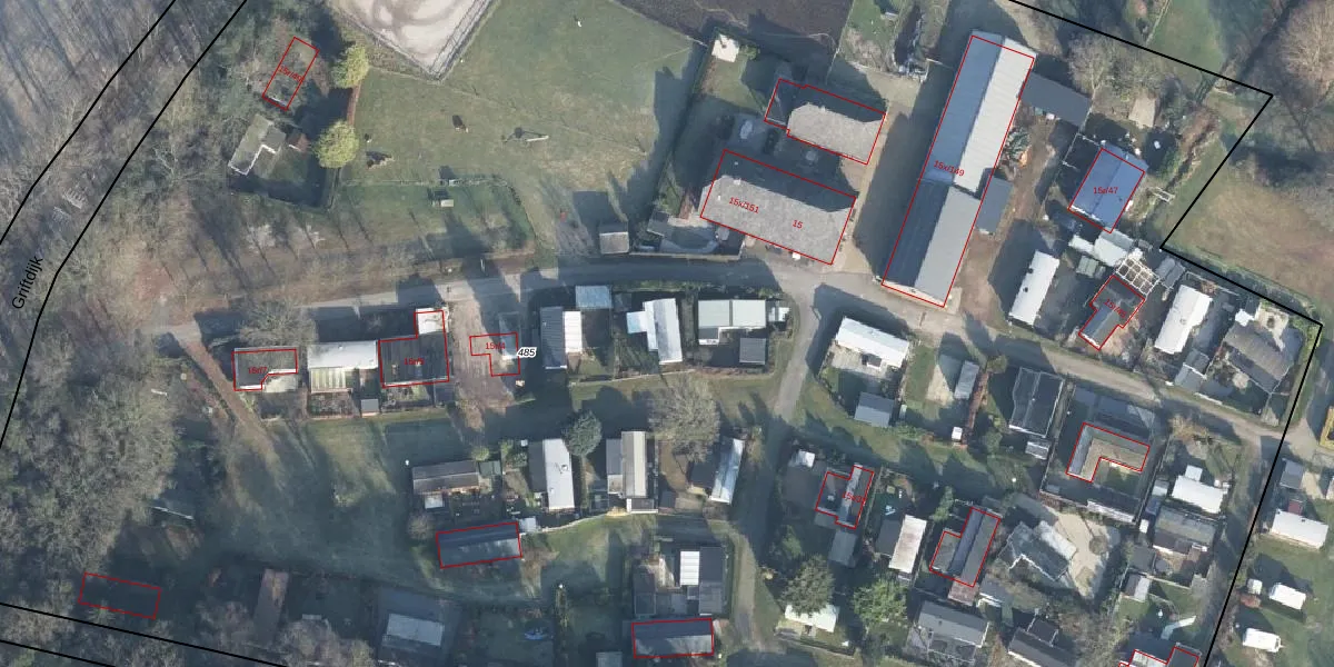 Het perceel waarop Griftdijk 15-r-2 staat heeft een oppervlakte van 2,2 ha. Dit is een zeer groot perceel. De perceeloppervlakte wordt geregistreerd door het Kadaster. Gedetailleerde informatie over de maten van dit perceel kunt u vinden in het rapport Kadastrale kaart met maatvoering van Griftdijk 15-r-2.